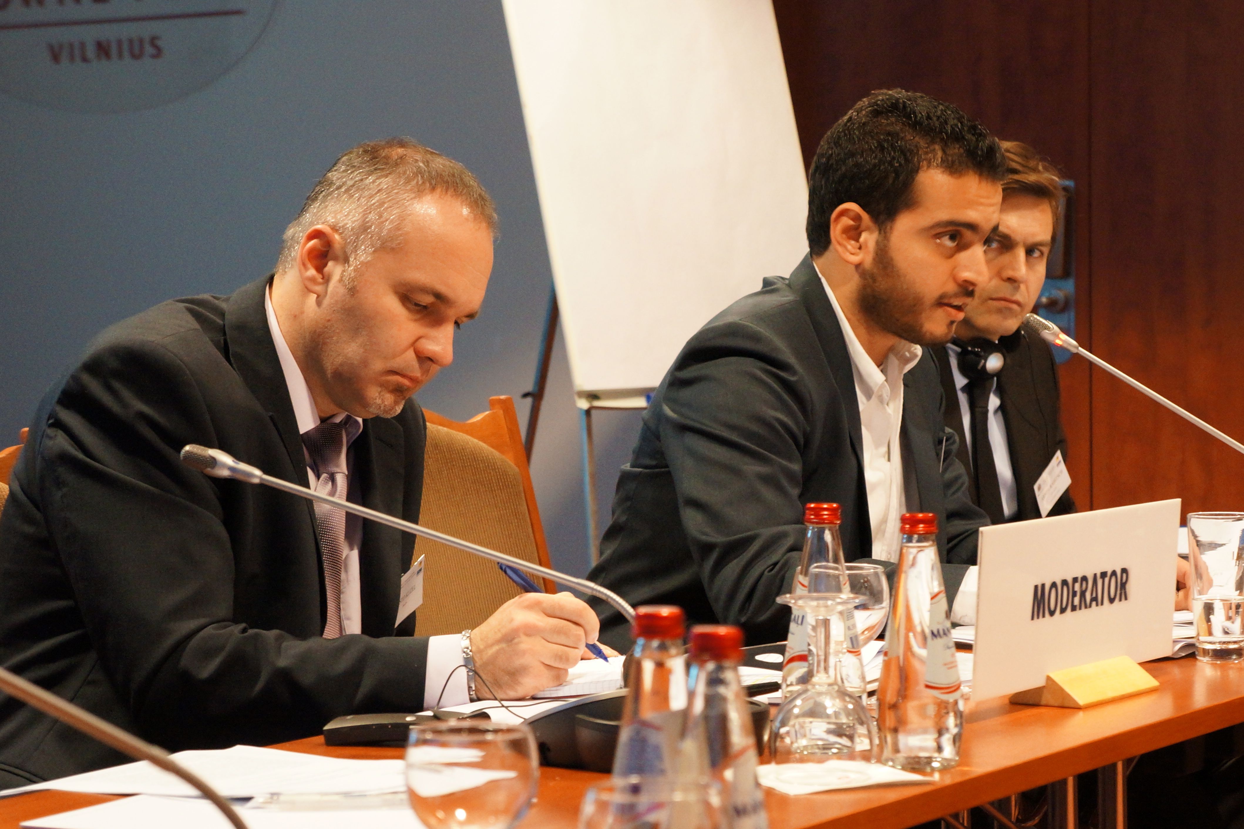 (L-r) Rast’o Kužel, Executive Director of Slovakian non-governmental organization, Memo 98; Sherif Abdel Azim of the Egyptian Association for Community Participation Enhancement and Armin Rabitsch, ODIHR Senior Election Adviser, moderate the working session on good electoral practice at the OSCE-Mediterranean Partner Countries’ Conference for Civil Society, Vilnius, Lithuania, 4 December 2011.