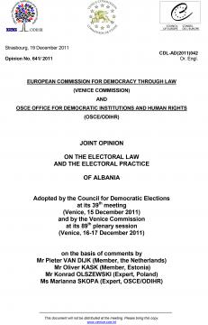 On 24 August 2011, the Secretary General of the Council of Europe asked the Venice Commission to provide an opinion on the question of which improvements should be made to electoral legislation and practice in Albania in the light of recent experience. The present Opinion has been prepared jointly by the Venice Commission and OSCE/ODIHR on the basis of comments by Mr Pieter van Dijk (member of the Venice Commission, the Netherlands), Mr Oliver Kask (member, Estonia), Mr Konrad Olszewski (expert of the Venice Commission, Poland) and Ms Marianna Skopa (expert, OSCE/ODIHR).