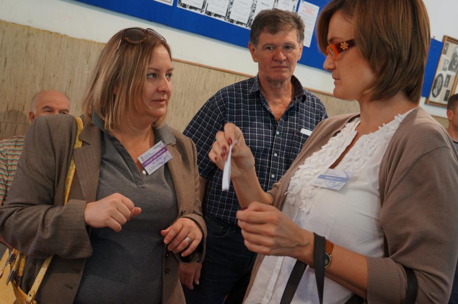 Head of ODIHR’s Elections Department Beata Martin-Rozumilowicz speaks to Maja Sandić, interpreter at the OSCE/ODIHR Limited Election Observation Mission to Serbia’s parliamentary and early presidential elections, during observation of the voting at a polling station in central Zemun, 6 May 2012.