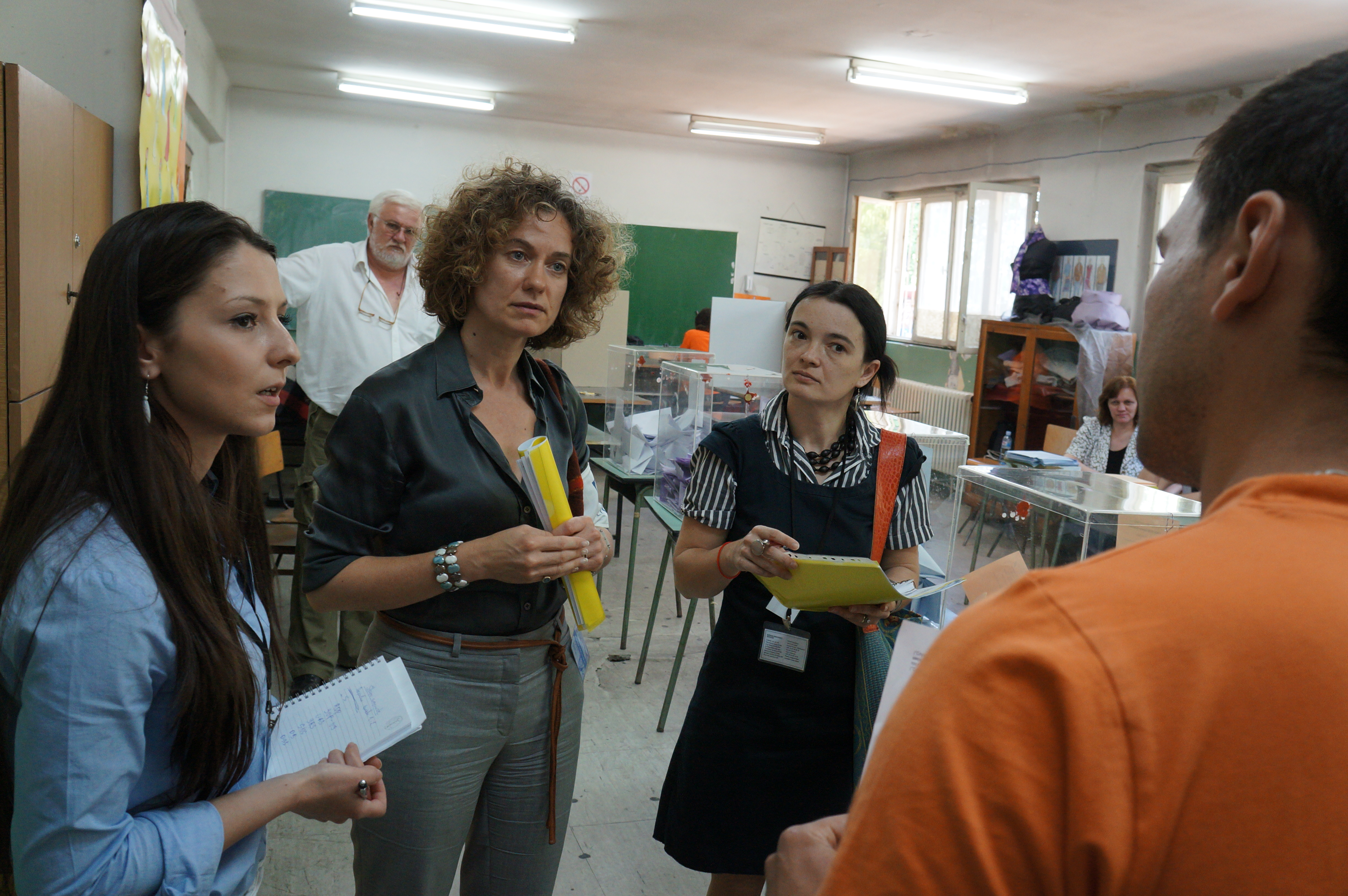 Corien Jonker (second from left), Head of the OSCE/ODIHR Limited Election Observation Mission (LEOM) to the parliamentary elections and early presidential elections in Serbia, speaks to an election commission official at a polling station in Staro Sajmište, Belgrade, 6 May 2012.