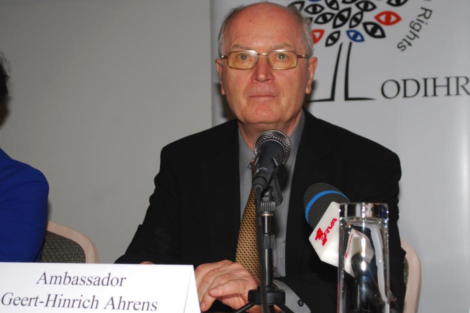 Ambassador Geert-Hinrich Ahrens, the head of the OSCE/ODIHR Limited Election Observation Mission to the 14 October early parliamentary elections in Montenegro, answers questions from journalists at the Mission’s opening press conference, Podgorica, 14 September 2012.