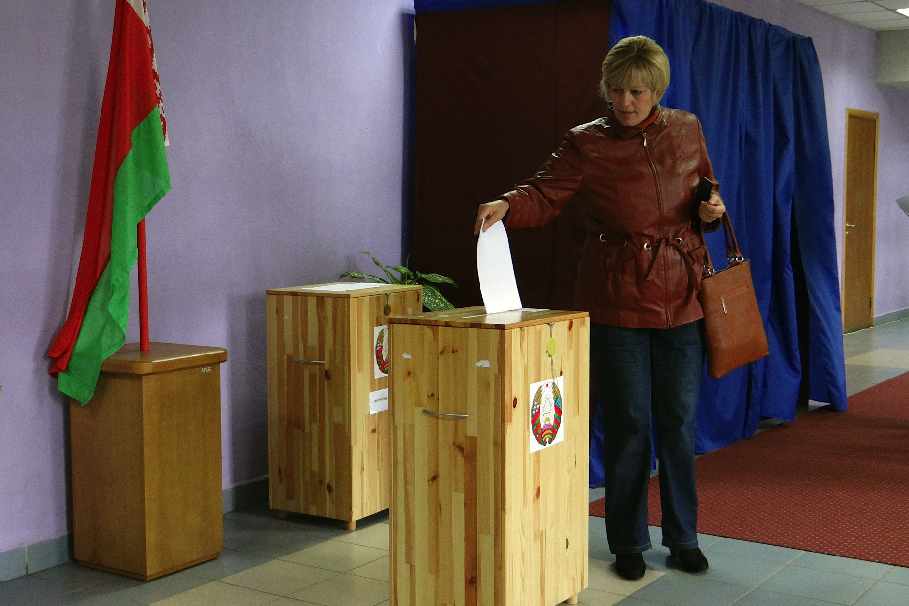 A voter casting her ballot at a polling station in Lagoisk, 23 September 2012.