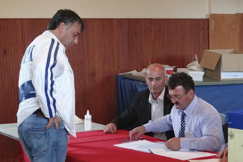A polling board member in the Golubovci settlement of Podgorica checking a voter’s identification before giving him a ballot during early parliamentary elections in Montenegro, 14 October 2012.