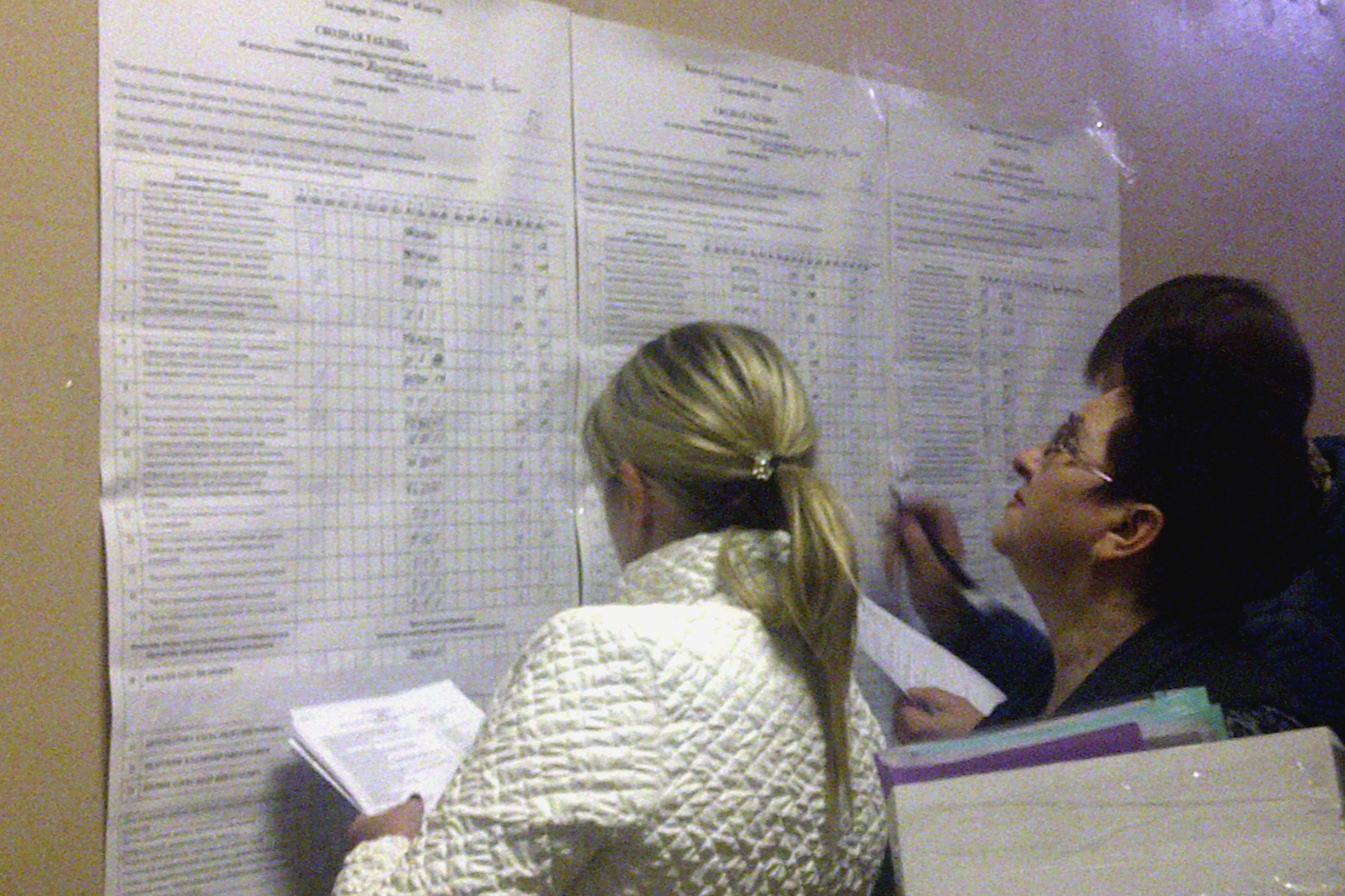 Officials in Ryazan enter election results from polling stations into a table of results at a higher-level election commission as a measure of transparency during the 14 October 2012 ‘single voting day’ in the Russian Federation.