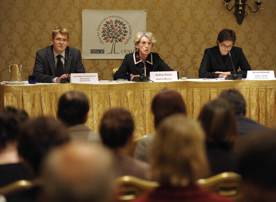 Ambassador Audrey Glover (centre), the Head of the OSCE/ODIHR Limited Election Observation Mission to the U.S. presidential election speaks to journalists in Washington, D.C., 5 November 2008. On the left is ODIHR Spokesperson Jens-Hagen Eschenbaecher.