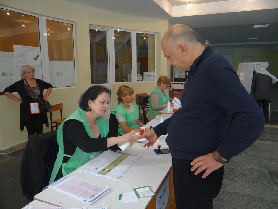 A voter having his finger sprayed with invisible ink - to prevent multiple voting - at a polling station in Tbilisi during Georgia's parliamentary elections, 8 October 2016.