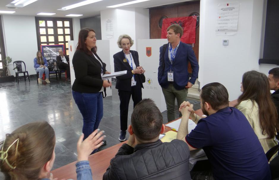 Ambassador Audrey Glover (c), Head of the ODIHR election observation mission for Albania's local elections, speaking with members of a polling station commission in Tirana, 14 May 2023.