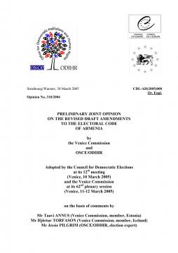 This Preliminary Joint Opinion follows the previous opinions on the Electoral Code of the Republic of Armenia provided by the Venice Commission and OSCE-ODIHR. This opinion is specifically based on the most recent previous opinion and on the draft law amending the Electoral Code, namely: • The Joint Opinion on the Draft Amendments to the Electoral Code of Armenia by OSCE/ODIHR and the Venice Commission from 6 January 2005 (CDL-AD(2004)049; further referred to as Joint Opinion); • The Draft Law on Amending and Supplementing the Electoral Code of the Republic of Armenia, submitted by Mr. Baghdasaryan, version of 14 December 2004, the draft for the second reading in the National Assembly of Armenia (CDL(2005)008). • The comments are based on the version of the Electoral Code of 3 August 2002 (CDL(2003)052). This report is preliminary in nature since further amendments to the draft are planned.