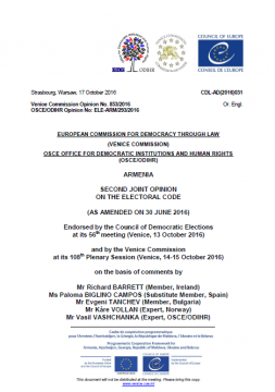 At its 108th Plenary Session, on 14-15 October 2016, the Venice Commission endorsed the Second Joint Opinion with the OSCE/ODIHR on the Electoral code of Armenia as of 30 June 2016. Following the invitation from the Minister of Justice of Armenia, the Venice Commission and the OSCE/ODIHR made second joint opinion on the final version of the Electoral Code, particularly in light of the extent to which the latest amendments addressed the recommendations presented in their first Joint Opinion, endorsed at 107th Plenary Session on 10-11 June 2016.