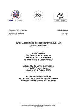 The Venice Commission and the OSCE/ODIHR provide an opinion on the consolidated Election Law of the Republic of Armenia, 1999 as amended to December 2007. This draft opinion is based upon an English translation of the law without further clarifications with the Armenian text. It is possible that some issues have been misinterpreted due to incorrect translation. Previous Joint Opinions by the Venice Commission and the OSCE/ODIHR focused on three main issues: election administration, complaints and appeals, and mechanism for ensuring the integrity of the vote. Previous opinions always underscored that the conduct of genuinely democratic elections depends not only on a detailed and solid election code but on good faith