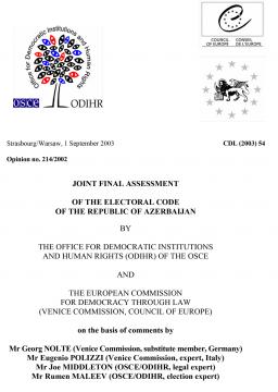 After a prolonged genesis, the Electoral Code of the Republic of Azerbaijan (below “the code”) was adopted by the national parliament (Milli Majlis) on 27 May 2003. The Code governs the conduct of referendums and parliamentary, presidential and municipal elections in one very substantial and comprehensive document. Over the last year, the Venice Commission and the OSCE-ODIHR (below “the two organisations”) engaged in an intensive dialogue with the drafters of the code in order to improve the successive drafts. Both organisations have produced a series of preliminary assessments suggesting a large number of recommendations.