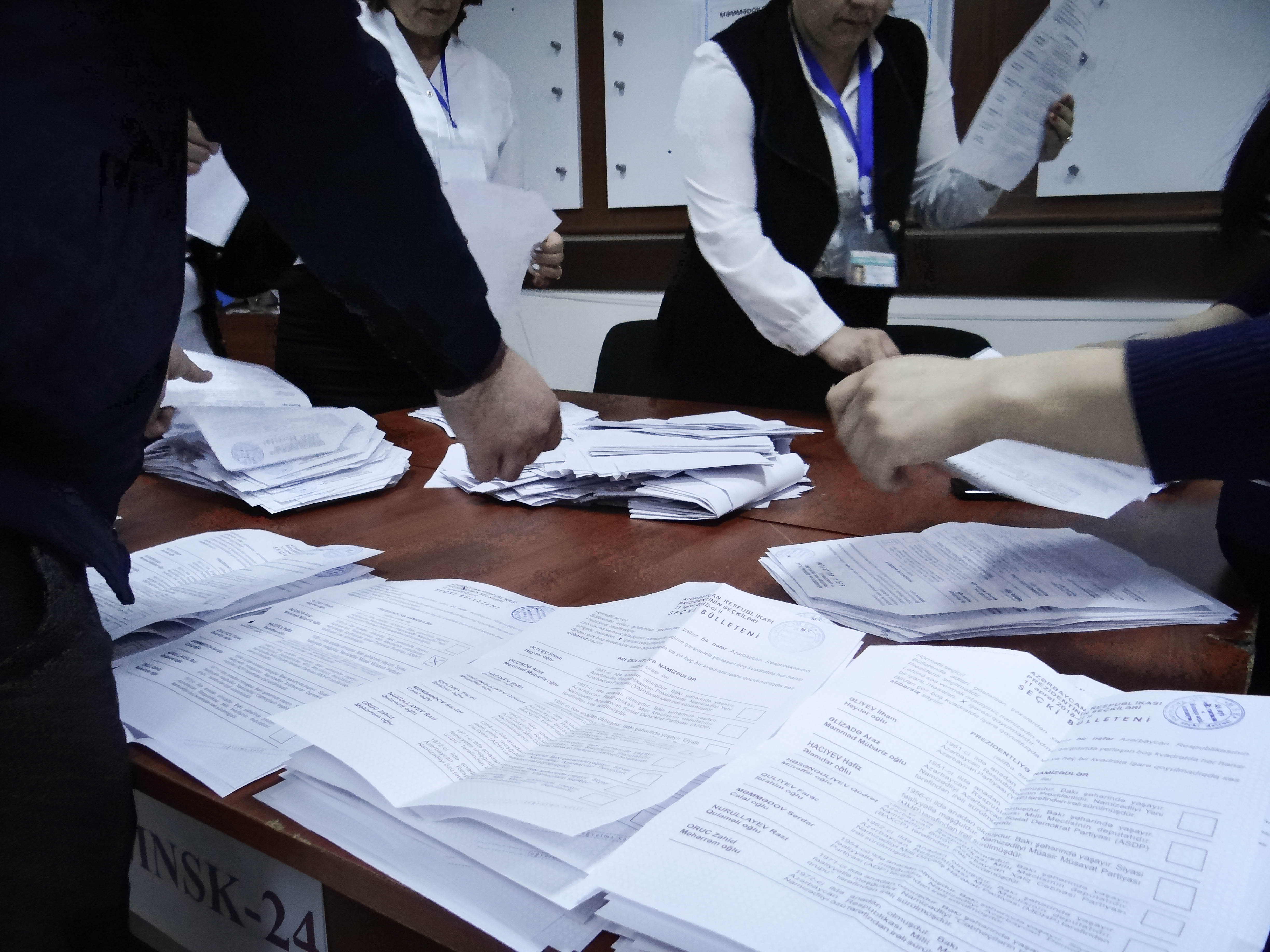 Ballots being sorted for counting at a polling station in Baku after voting in the early presidential election in Azerbaijan, 11 April 2018.