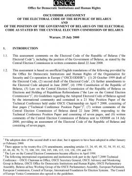 This assessment comments on the Electoral Code of the Republic of Belarus (“the Electoral Code”), including the position of the Government of Belarus, as stated by the Central Election Commission in written comments dated 22 June 2000.