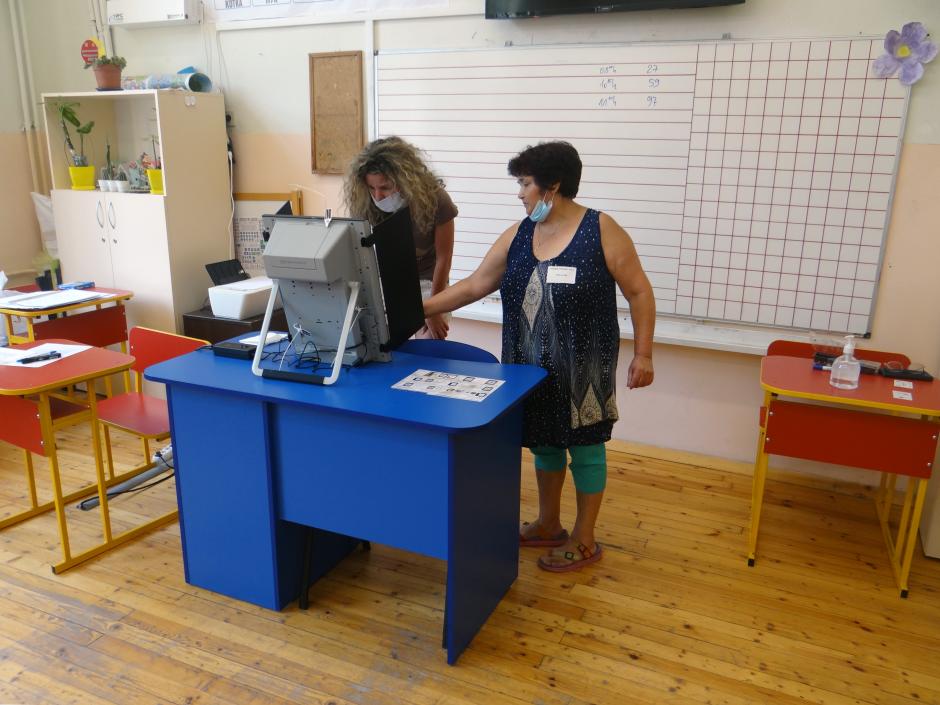 A polling station worker in Sofia helps a voter cast her ballot for Bulgaria's early parliamentary elections using an electronic voting machine, 11 July 2021.
