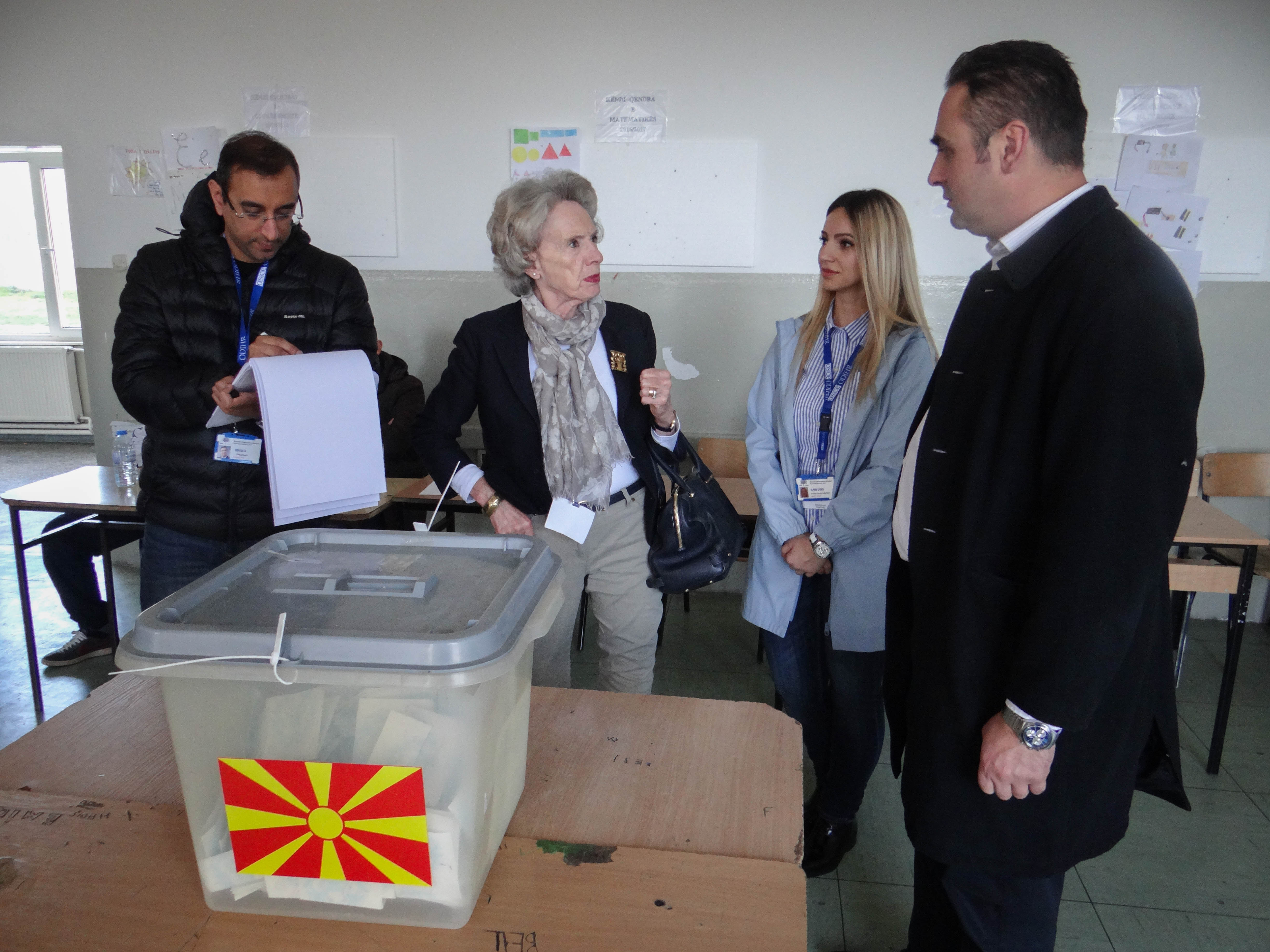 Ambassador Audrey Glover, head of the OSCE/ODIHR election observation mission, speaking with the head of a polling station commission in Tetovo during the second round of local elections in the Former Yugoslav Republic of Macedonia, 29 October 2017.