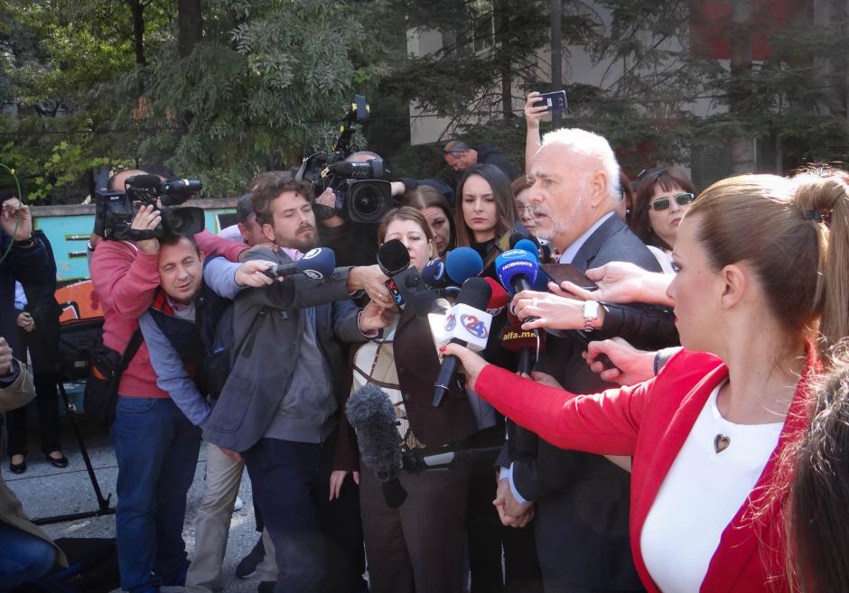Ambassador Jan Petersen, head of the referendum observation mission from the OSCE Office for Democratic Institutions and Human Rights, answering media questions outside a polling station in Skopje, 30 September 2018.