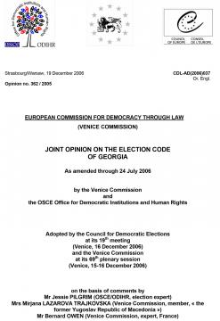The Venice Commission was requested on 3 October 2005 by the Parliament of Georgia to provide an Opinion on the Election Code of Georgia. The most recent joint opinion of the Venice Commission and the Organisation for Security and Co-operation in Europe’s Office for Democratic Institutions and Human Rights (OSCE/ODIHR) on the Election Code is dated 16 June 2006 and addresses amendments through 23 December 2005. Following adoption of additional amendments, the OSCE/ODIHR and the Venice Commission agreed on providing a revised joint opinion. The present legal review represents therefore an update to the June 2006 Opinion and covers the latest amendments of 23 June and 24 July 2006.