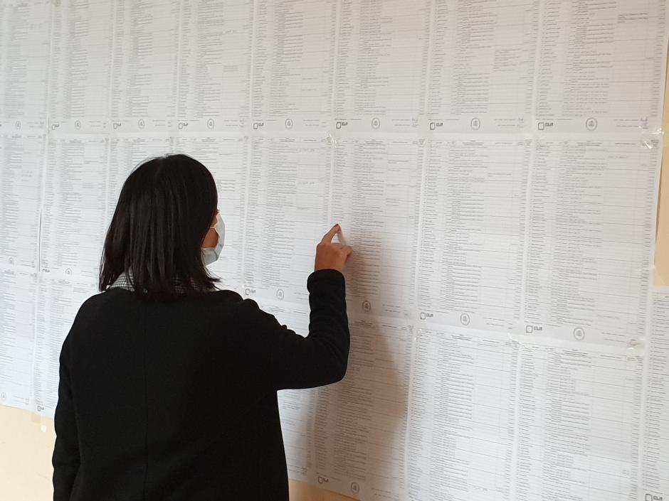 A voter consults the candidate list in a polling station in Tbilisi during Georgia’s local elections. 2 October 2021.