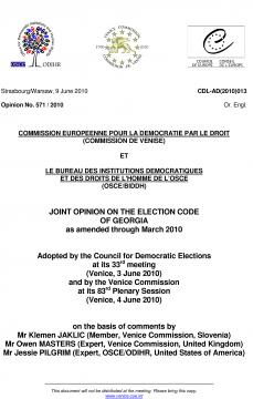 At the request of Georgian authorities, the European Commission for Democracy Through Law (“the Venice Commission”) of the Council of Europe and the Office for Democratic Institutions and Human Rights of the Organization for Security and Co-operation in Europe (“OSCE/ODIHR”) have prepared the following comments and recommendations on the Unified Election Code of Georgia (“the Code”). The most recent joint opinion of the Venice Commission and OSCE/ODIHR is dated 28 October 2008 and contains commentary on amendments through July 2008.