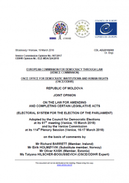 This opinion was prepared jointly by the Council of Europe's Venice Commission and the OSCE Office for Democratic Institutions and Human Rights (ODIHR) and adopted by the Council for Democratic Elections at its 61st meeting (Venice, 15 March 2018) and by the Venice Commission at its 114th plenary session (Venice, 16-17 March 2018).