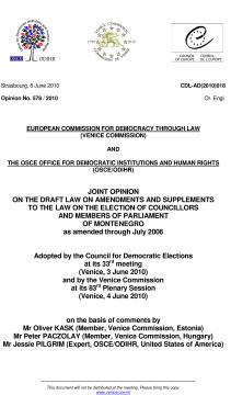 The Council of Europe – Commission on Democracy Through Law (“the Venice Commission”) and the Organization for Security and Cooperation in Europe – Office for Democratic Institutions and Human Rights (OSCE/ODIHR) received a request from the Parliament of Montenegro to conduct a review of a working version of the Law on Amendments and Supplements to the Law on Election of Councilors and Members of Parliament (hereinafter the draft Law), prepared by a multi-party working group. This request was submitted on 23 March 2010. The joint assessment below takes into consideration previous findings and recommendations made by the OSCE/ODIHR in its final reports from election observation missions in Montenegro as well as progress made by authorities and political parties in Montenegro in their endeavors to improve the legal framework for elections and meet Council of Europe and OSCE commitments and other international standards.
