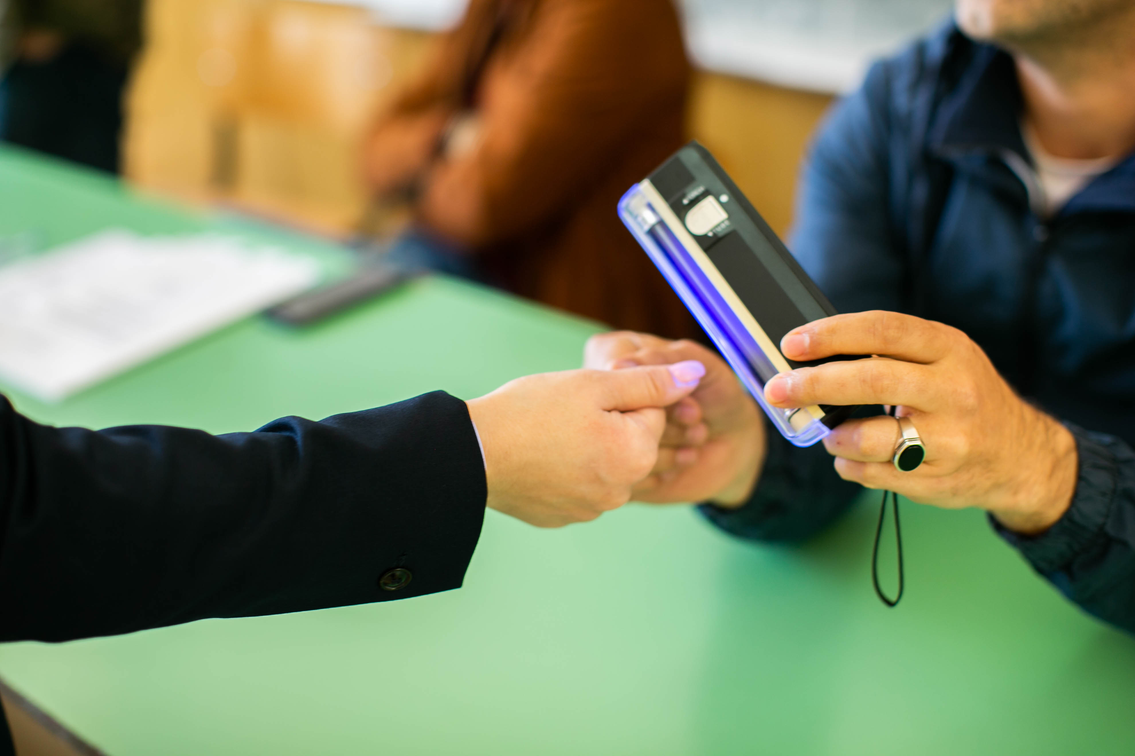 A member of a polling station commission in Skopje examines a voter's finger at the station's entrance during North Macedonia's presidential election, 21 April 2019.