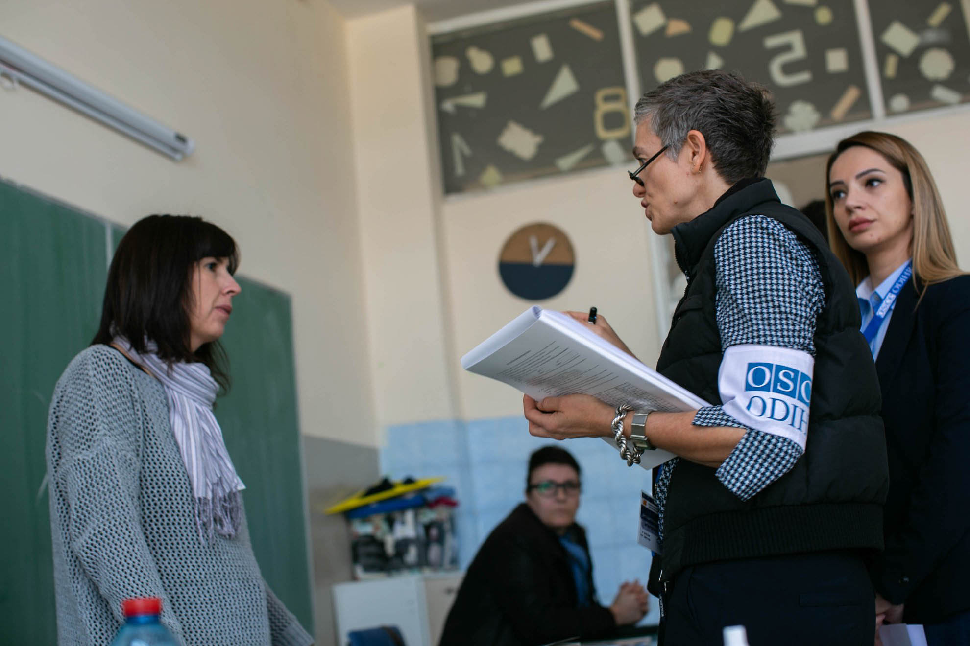 ODIHR observers visit a polling station in Skopje during North Macedonia's presidential election, 21 April 2019.