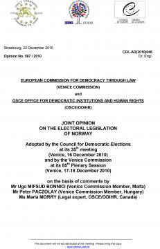 In a letter dated 31 May 2010, Mr Dag Henrik Sandbakken, Secretary of State of the Norwegian Ministry of Local Government and Regional Development (the Ministry) requested an evaluation of those aspects of the Electoral System of Norway relating to electoral dispute resolution from the European Commission for Democracy through Law (the Venice Commission). More specifically, the Commission was requested to assess “the provisions regarding the adjudication of complaints and appeals, and approval of elections, and how these would relate to Norway’s international obligations”. These provisions are notably Article 55 of the Constitution (CDL-EL(2010)026) and Chapter 13 of the Representation of the People Act