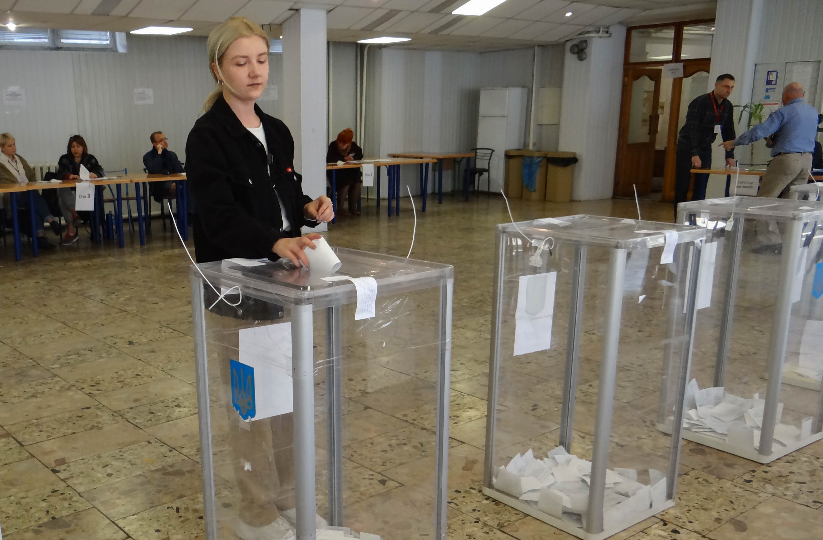 A voter casting her ballot at a polling station in Kiev for the second round of Ukraine's presidential election, 21 April 2019.