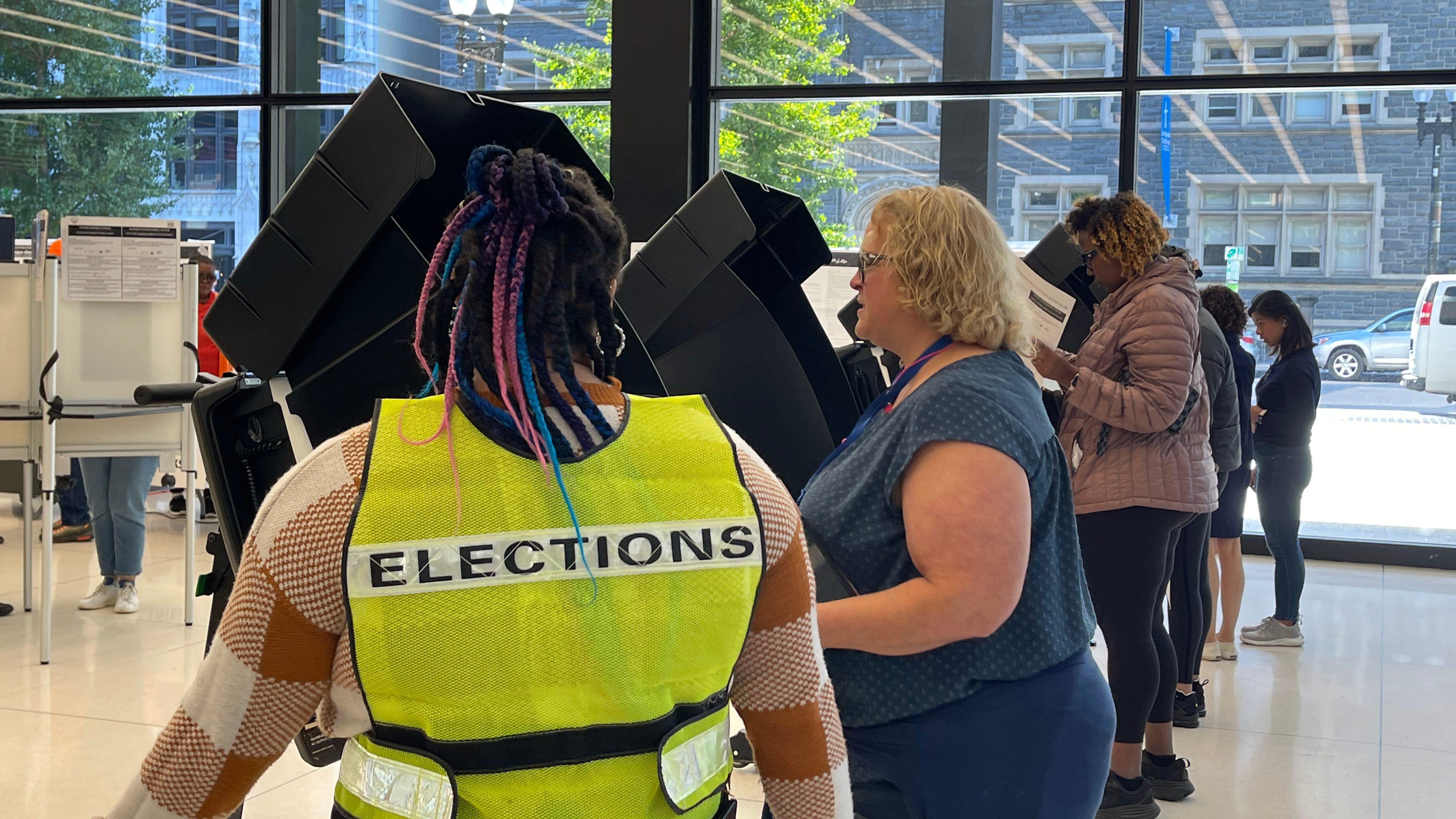 A polling station official assists voters casting their ballot during general elections in the United States, Washington D.C., 5 November 2024.