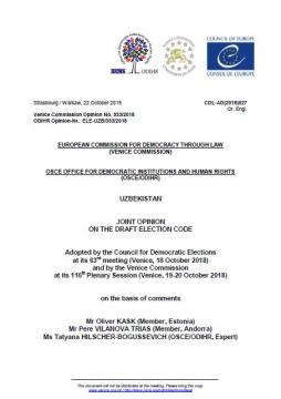 This Joint Opinion is provided with the aim of assisting the authorities of Uzbekistan, political parties, and civil society in their efforts to bring the legal framework for elections into line with OSCE commitments, Council of Europe’s standards and other international obligations for democratic elections. It was prepared in response to a request from the Chairperson of the Central Election Commission of Uzbekistan addressed to the OSCE Office for Democratic Institutions and Human Rights (ODIHR) and of the Council of Europe’s Venice Commission in July 2018.