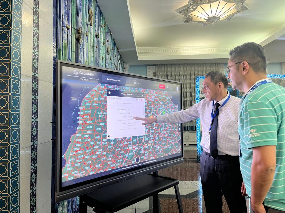 International observers examine an interactive map of polling stations during Uzbekistan's constitutional referendum. Tashkent, 30 April 2023.