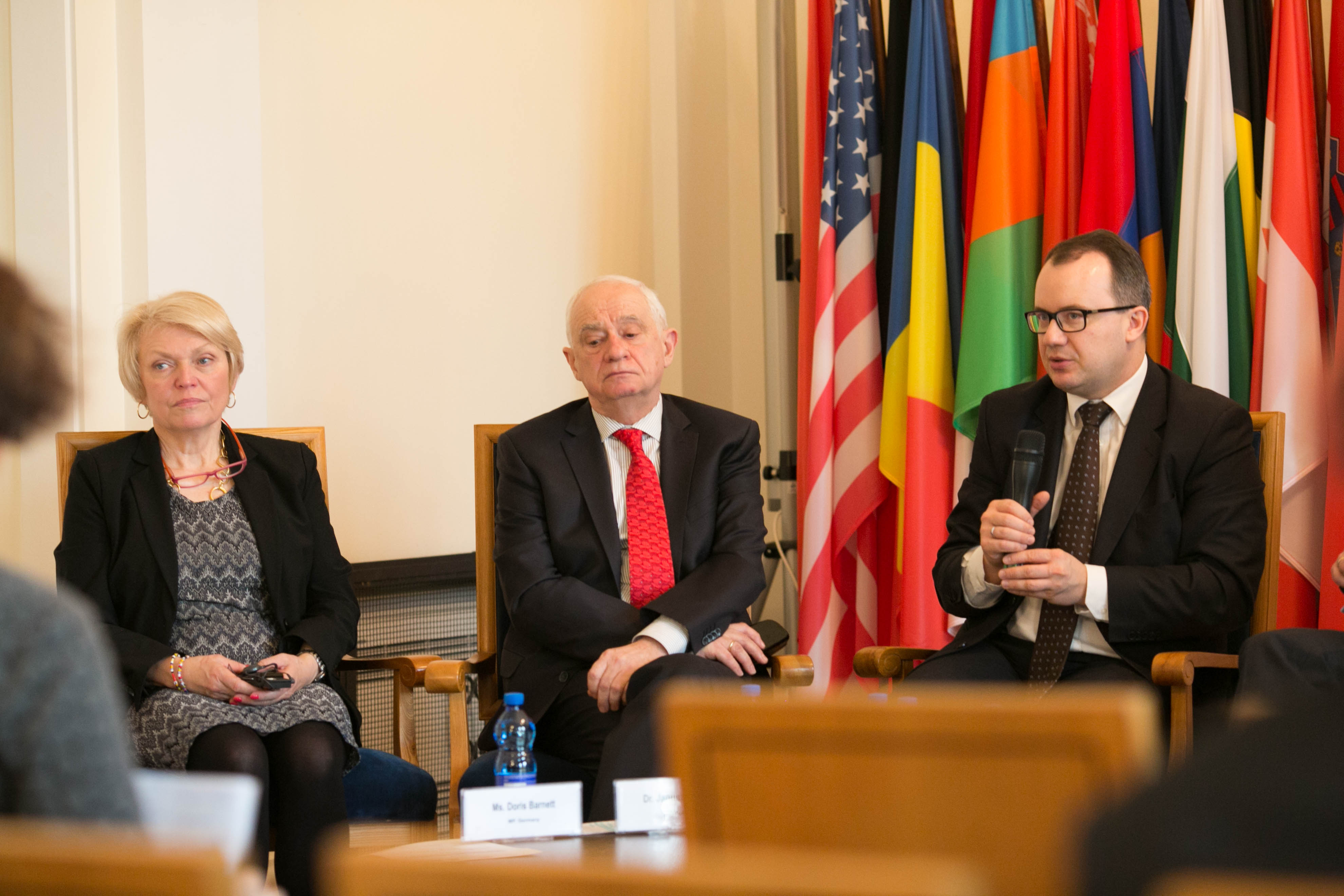 Adam Bodnar, the Polish Commissioner for Human Rights, speaks as Doris Barnett, member of the German Bundestag and the OSCE Parliamentary Assembly (l), and Janusz Zemke, member of the Polish Parliament and the European Parliament (c), listen at an event on strengthening the work of ombuds institutions for the armed forces in the OSCE region co-organized by ODIHR, Warsaw, 20 March 2017.