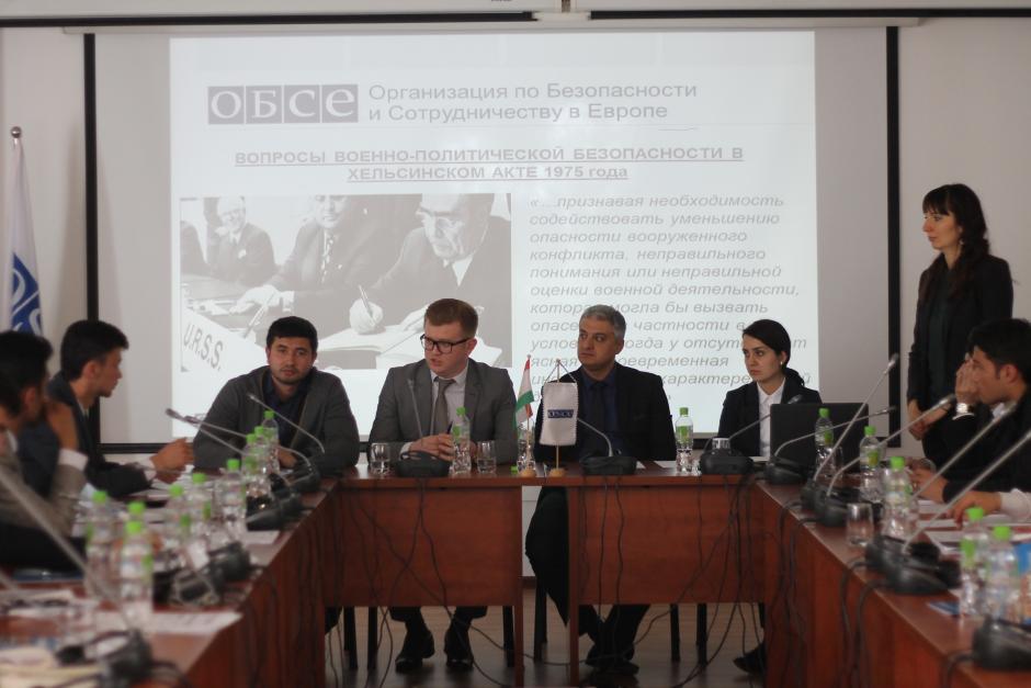 Participants of the Model OSCE and staff from the Politico-Military Department during a briefing, Dushanbe, 22 March 2017.