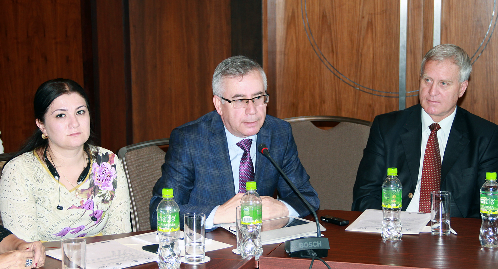 Chairman of National Association of Independent Mass Media in Tajikistan, Nuriddin Karshiboev (c), and Head of the OSCE Office’s Human Dimension Department in Tajikistan, Scott Kearin (r), speaking at a World Press Freedom Day conference, Dushanbe, 3 May 2017.