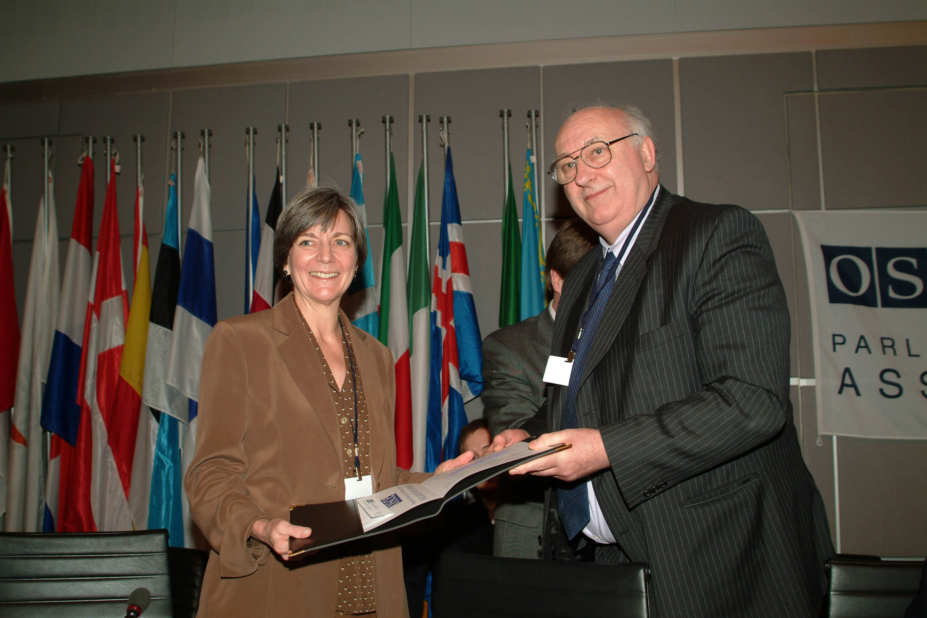 Ann Cooper, Executive Director of the Committee to Protect Journalists, receives OSCE's 2004 Journalism and Democracy Prize from OSCE PA President Bruce George, Vienna, 19 February 2004.