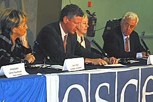 Pieter de Crem (centre), who led the OSCE observers during parliamentary elections in Bosnia and Herzegovina, delivers preliminary post-election statement in Sarajevo on 6 October 2002.
