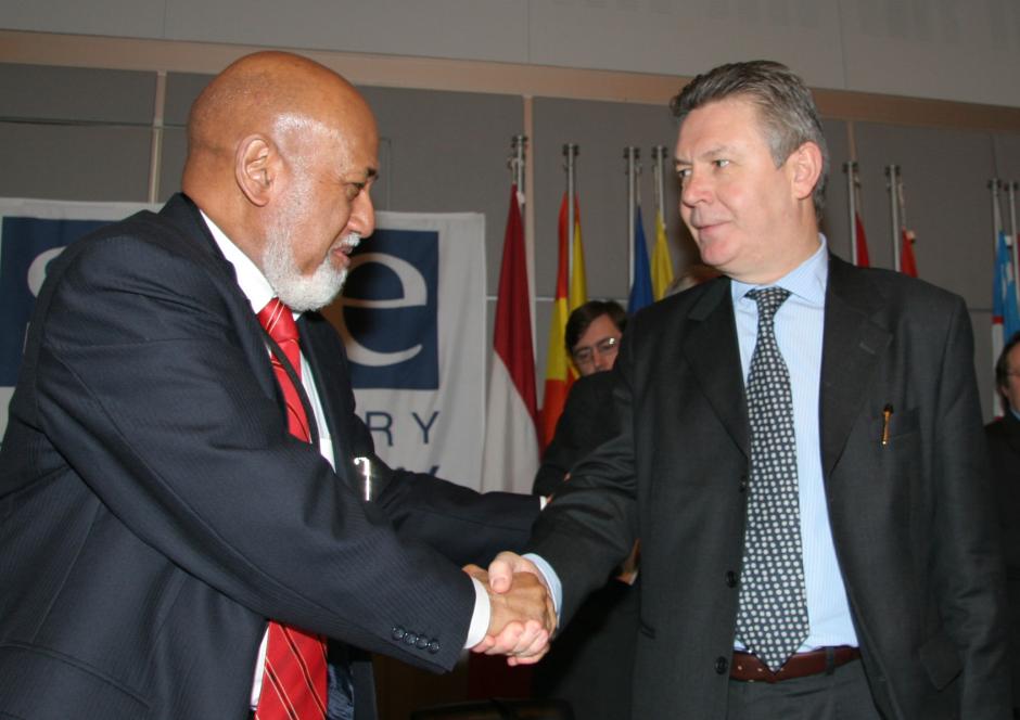 OSCE Chairman-in-Office Karel De Gucht (right) is welcomed by Alcee Hastings, President of the OSCE Parliamentary Assembly, in Vienna 23 February 2006.