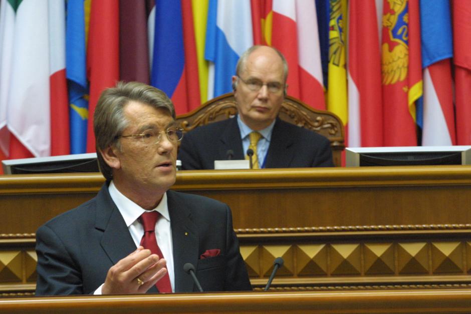 Ukrainian President Viktor Yuschenko addresses the Plenary Session of the OSCE Parliamentary Assembly in Kyiv on 5 July 2007. On the right is the OSCE PA President, Goran Lennmarker.
