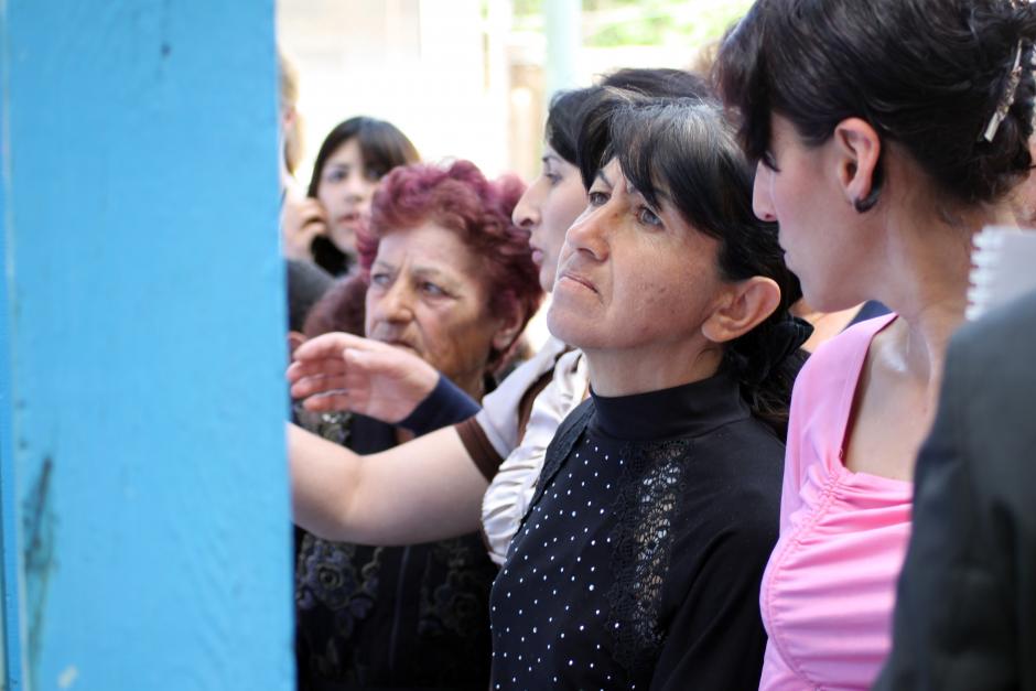 Armenian voters look for their names on publicly displayed voter lists, at a precinct in Ararat on election day, 6 May 2012.