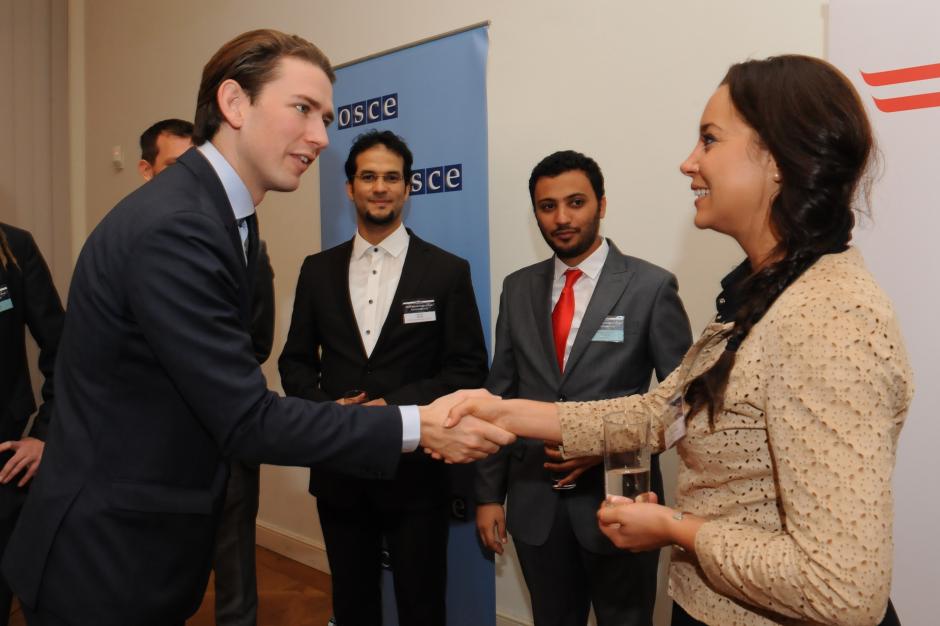 Sebastian Kurz, Minister of Foreign Affairs of Austria greeting a participant during the OSCE Mediterranean Conference, Vienna, 6 October 2016.