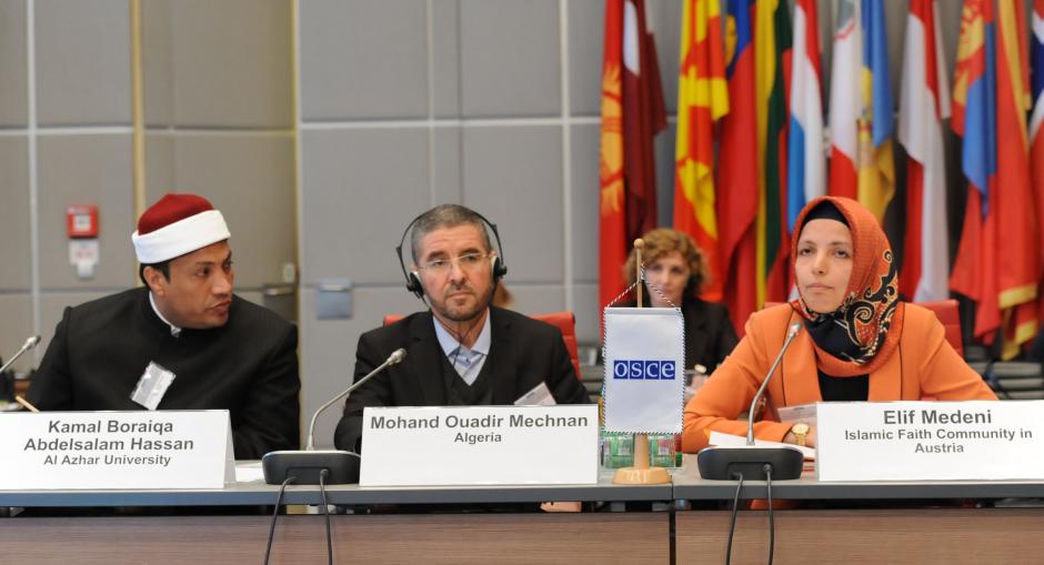 (L-r): Kamal Boraiqa Abdelsalam Hassan, Professor of the Islamic Studies at the Al Azhar University in Egypt, Mohand Ouadir Mechnan, Director for Religious and Educational Affairs at Algeria’s Ministry of Religion, and Elif Medeni, Representative of the Islamic Faith Community in Austria, at OSCE Mediterranean Contact Group meeting, 19 April 2016, Vienna.