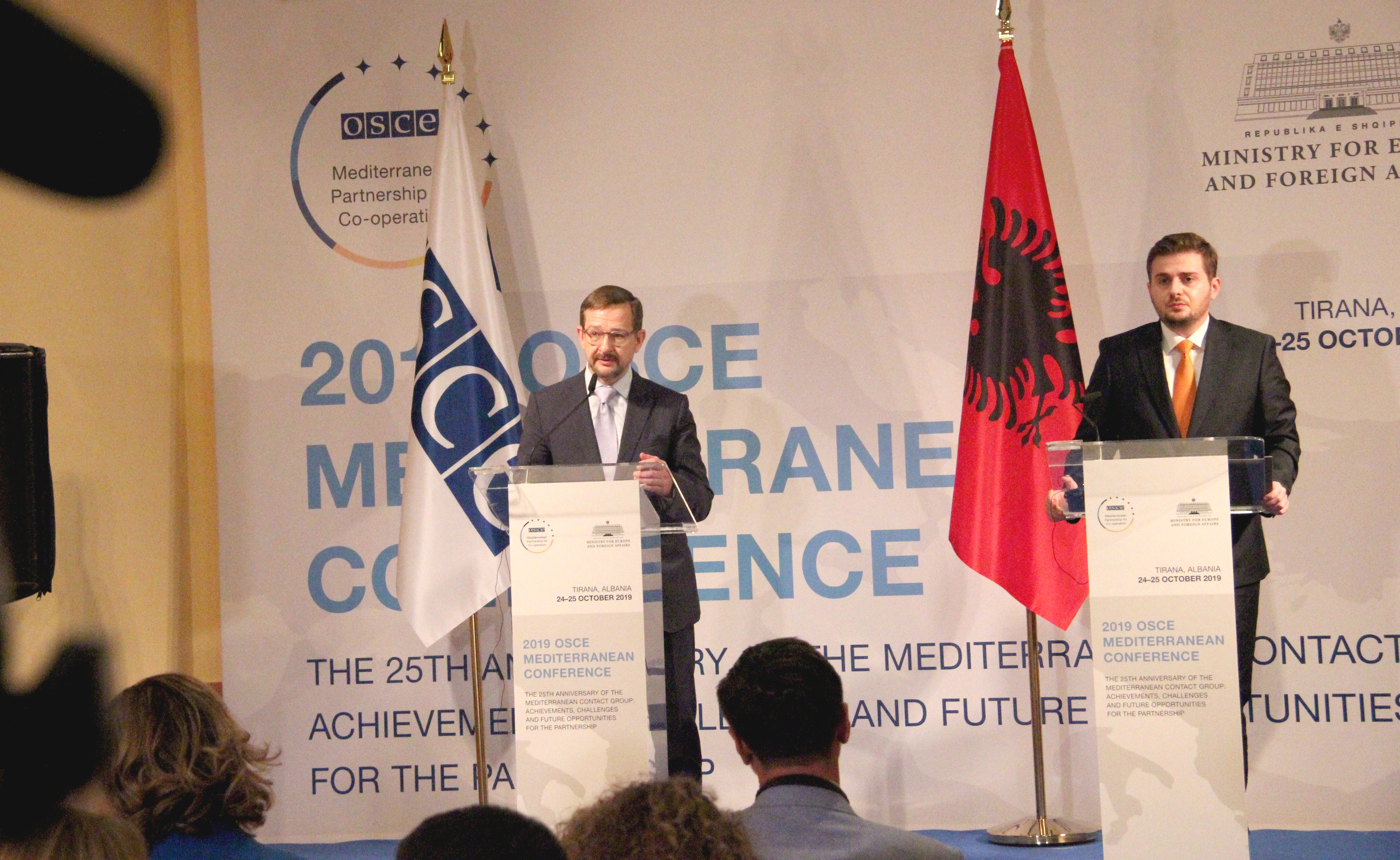 OSCE Secretary General Thomas Greminger and Albania's Acting Foreign Minister Gent Cakaj at the 2019 Mediterranean Conference closing press conference, Tirana, 25 October 2019.