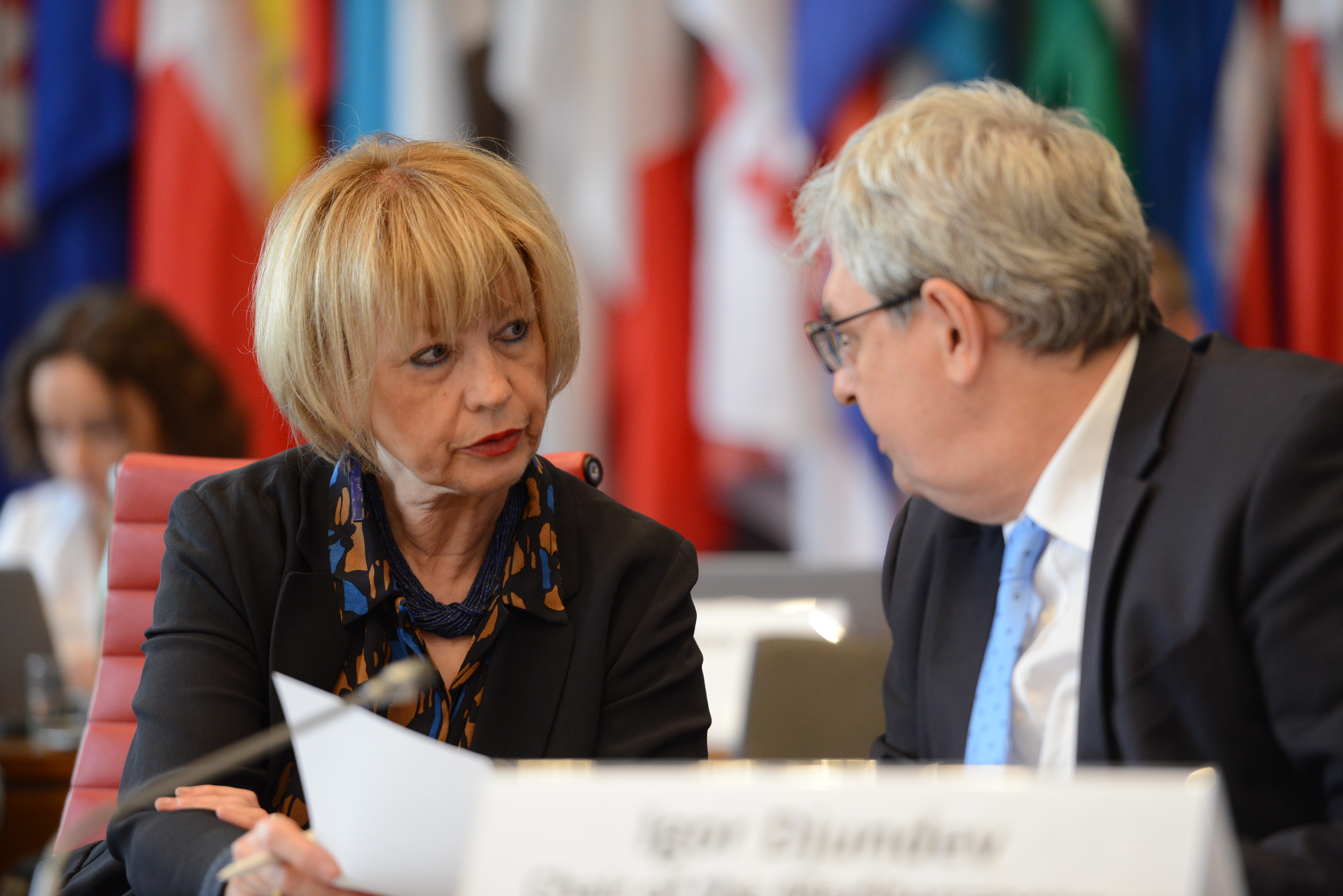 OSCE Secretary General Helga Maria Schmid and Igor Djundev, Chair of the Mediterranean Partners for Co-operation Group, at the OSCE Mediterranean Partners meeting, Vienna, 28 June 2022.