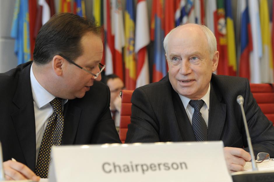 Sergey Lebedev (r), Executive Secretary of Commonwealth of Independent States, alongside Ambassador Ihor Prokopchuk, Chairperson of the OSCE Permanent Council, Vienna, 27 June 2013.