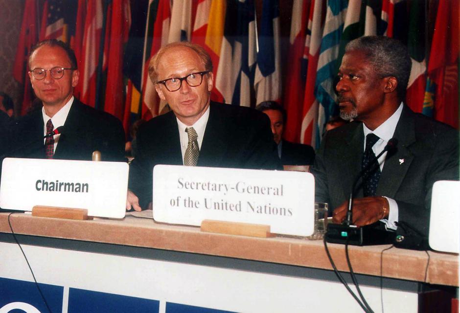 United Nations Secretary-General Kofi Annan (right) prepares to