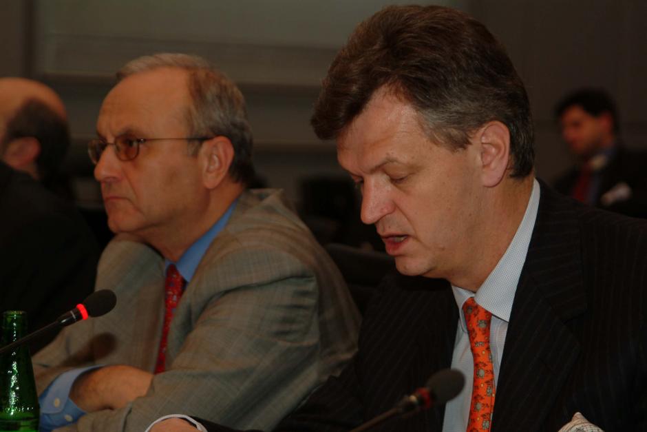 Chairman of the OSCE Permanent Council, Ambassador Ivo Petrov, listens to Croatian Foreign Minister Miomir Zuzul, 16 February 2004.