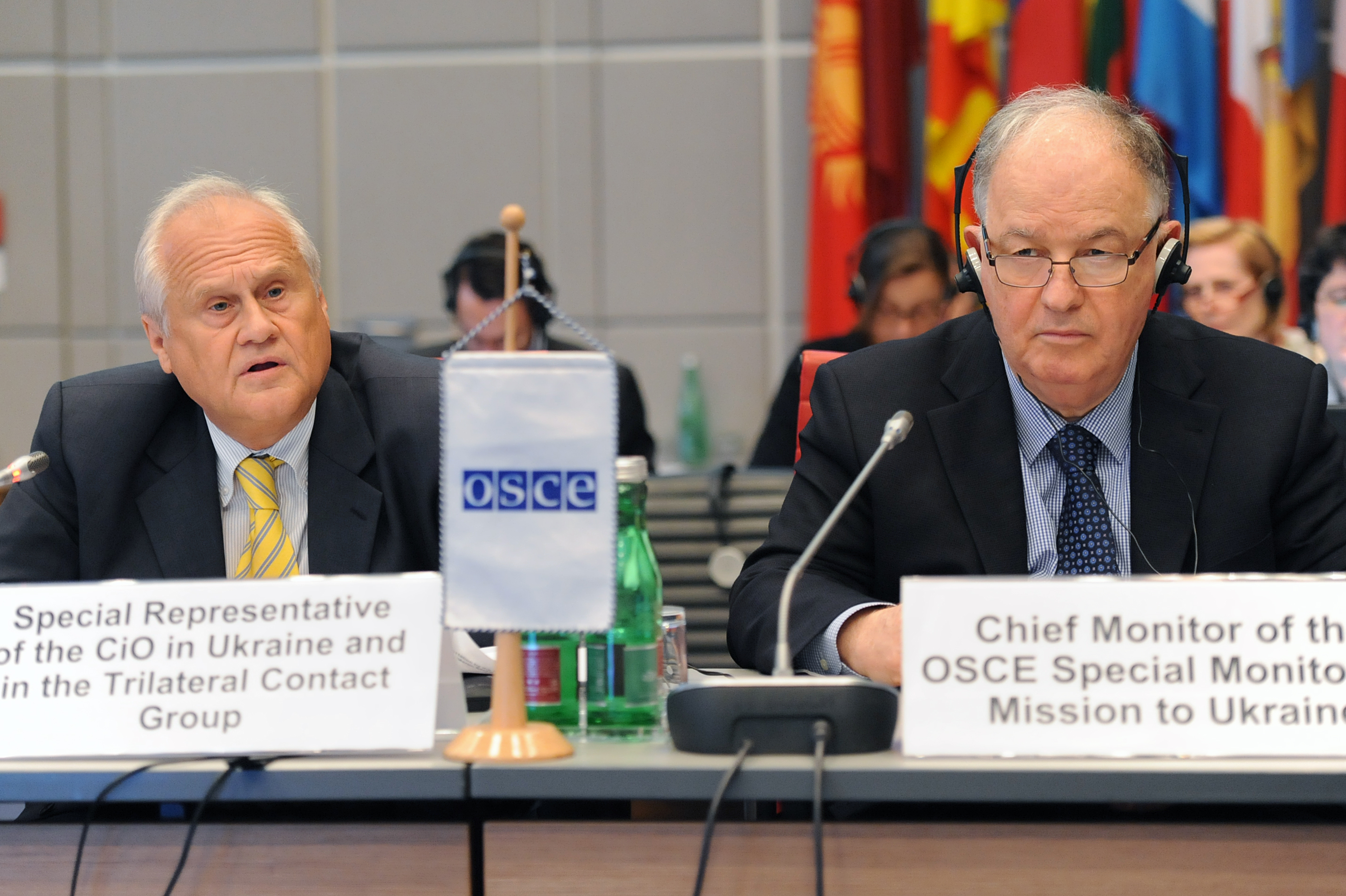 (l-r) Martin Sajdik, the Special Representative of the OSCE Chairperson-in-Office in Ukraine and in the Trilateral Contact Group and Ertugrul Apakan, Chief Monitor of the OSCE Special Monitoring Mission to Ukraine addressing the OSCE Permanent Council as part of their regular reporting process, Vienna, 28 July 2016.