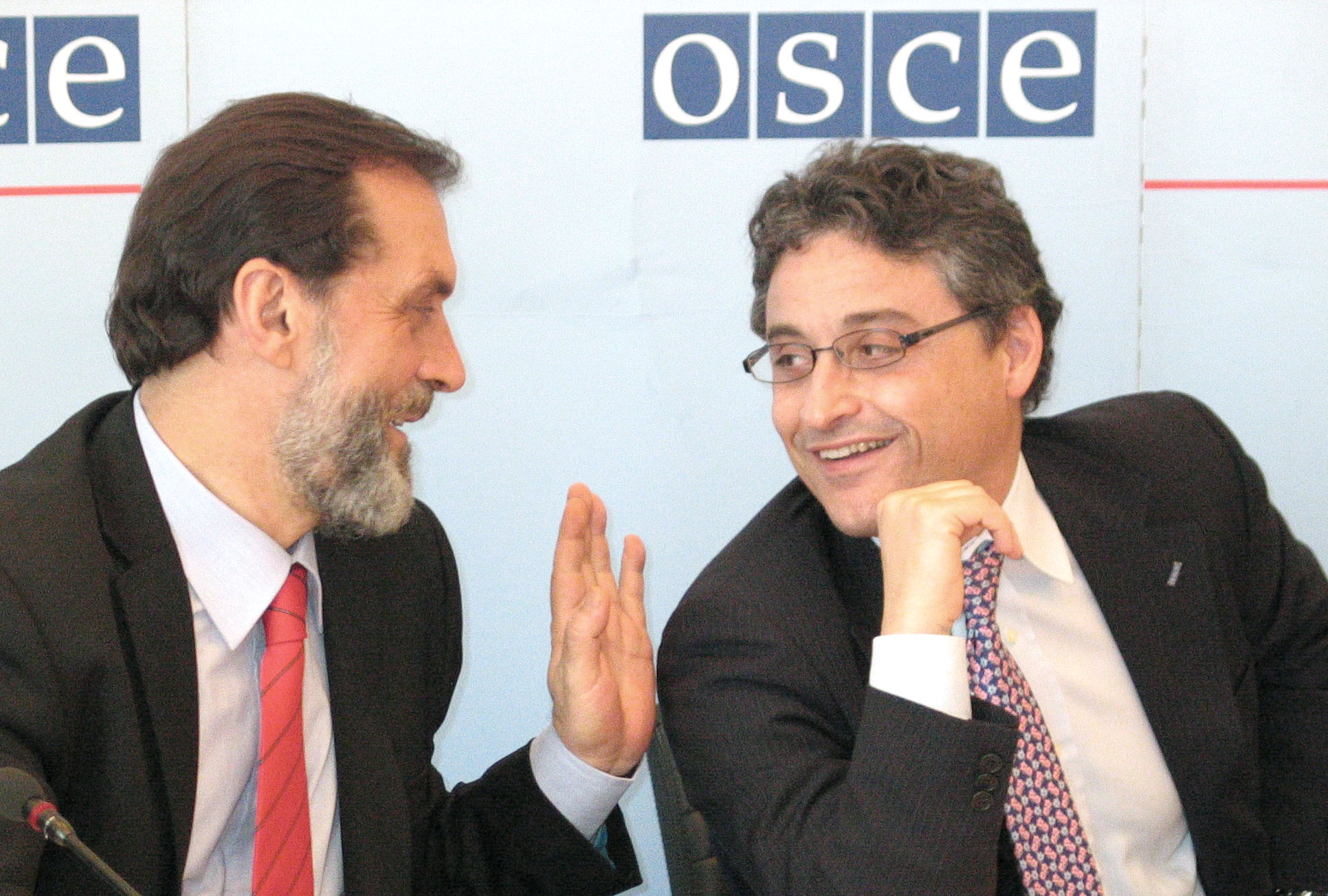 Vuk Draskovic, Foreign Minister of Serbia and Montenegro, shares a laugh with Amb. Maurizio Massari (right), Head of the OSCE Mission to Serbia and Montenegro, after a special session of the OSCE Permanent Council in Vienna, 18 June 2004.