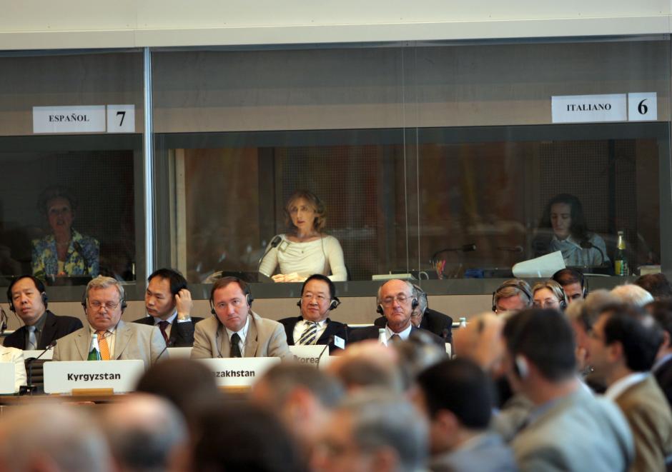 Sitting in booths behind delegations, interpreters at work at an OSCE Permanent Council at the Hofburg in Vienna, 21 July 2005. English, French, German, Italian, Russian and Spanish are the official OSCE languages.